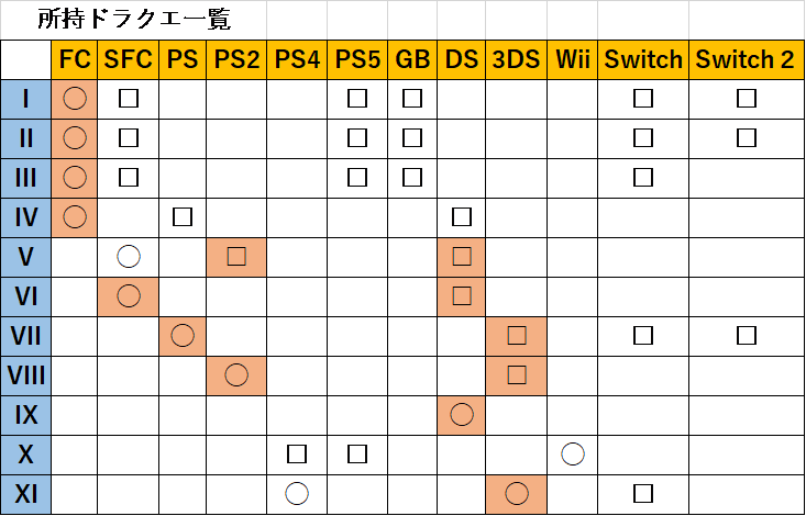 そして私の所持しているドラクエの一覧表になります!!橙色の背景に対応しているソフトが所持しているものになります。◯はオリジナル版、□はリメイク版になります。