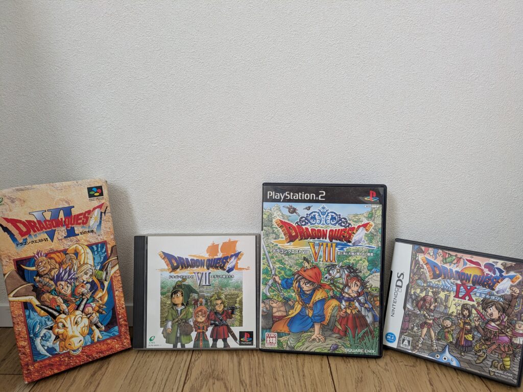 所持品のドラクエⅥ~Ⅸを並べてみました。そう考えたらドラクエⅥ~Ⅺって毎回ハードが変わっているんですね。